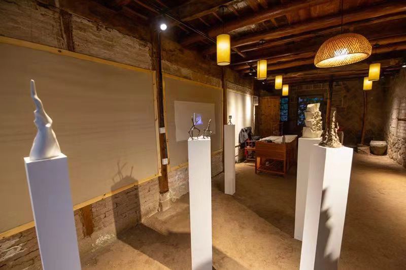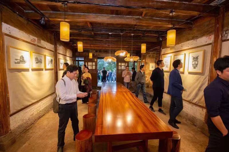 走进由石头堆砌的国际慢城诗画馆,一侧展馆内,眼前昏黄的灯光正点缀着墙上一幅幅黑白分明的钢笔画作,仔细观之,刚劲有力的钢笔线条纵横交错,细密紧凑,精细入微得刻画出中外各类建筑体,呈现出一种独具特色的美感。另一侧则零星陈列着各类雕塑与装饰作品,耐人寻味。
