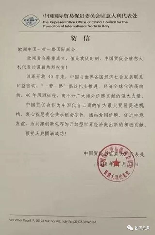 中国驻佛罗伦萨总领馆王辅国总领事莅临庆典现场并发表重要讲话,他首先对欧洲中国一带一路国际商会的成立表示热烈的祝贺,对商会的盛情邀请表示衷心感谢!王辅国总领事表示,欧洲中国一带一路国际商会的成立,意味着我们领区又诞生了一个新侨团。希望商会能够团结其他侨团,积极推动在意华社的守法与融入,加强与当地机构的沟通交流,为侨胞办实事、解难事;积极推动中意在各领域的合作,为意大利当地社会经济的发展,为中意两国人民间友谊的加深做出自己的努力和贡献。