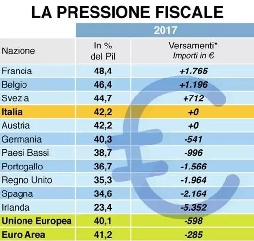 根据意大利手工艺人和小企业联合会(Cgia)研究办公室所做的调研,通过比较2017年欧洲各主要国家的税负情况,结果显示,意大利人每年的税务支出要比欧盟平均水平多600欧元。