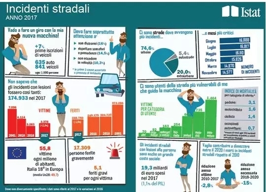 根据意大利国家统计局(ISTAT)的数据,2017年意大利有174933起造成人员伤亡的道路交通事故,包括246750人受伤,相比2016年有所下降。但死亡人数(包括事故后30天内死亡)3378人,相比2016年增长了2,9%。