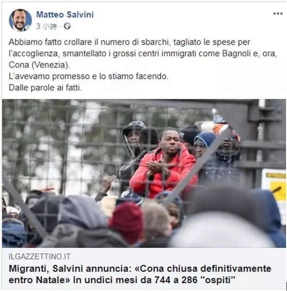 早在今年九月,萨尔维尼就表示将逐步减少难民的登陆数量,减少收容难民所产生的费用,关闭大型收容中心。当时就关闭了位于帕多瓦省的巴尼奥利收容中心。