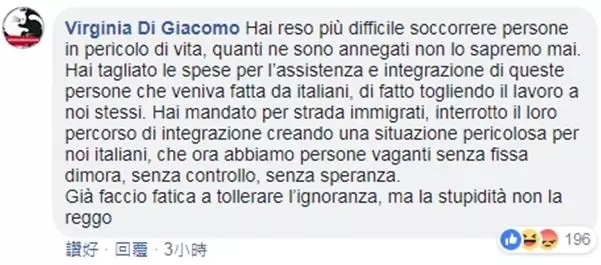 人的拯救工作变得更加困难,而这些工作都是意大利人在做,你实际上也夺走了我们自己的工作。你把难民们送上街头,关闭了他们融入意大利的道路,他们现在无家可归四处流浪,无法控制,没有希望,你(这么做)为我们意大利人制造了一个更加危险的生活环境。容忍无知已经让我很累了,愚蠢更是我无法忍受的。