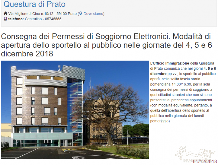 意大利华人街(微信订阅号:huarenjie0039)编译警察局网综合报道2018年12月1日普拉托消息:普拉托警察局官网发布通知,增加移民办窗口办理时间专门用于领取居留。除了星期一之外星期二2018年12月4日,星期三12月5日和星期四12月6日下午也有办公。