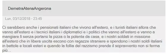 政客们,他们在当地吃饭却不从意大利带披萨或玉米糕,还有我们的士兵在国外执行任务时,与外国女孩去约会,把我们意大利的钱都花在外国的饭店和酒吧里。当种族主义起势时挡也挡不住。