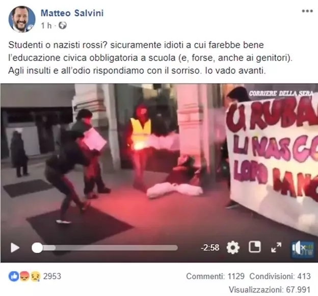 萨尔维尼本人也在脸书(Facebook)上回应道:“这是学生还是纳粹分子?毫无疑问是群傻瓜,看来他们得好好上几节“文明必修课”(或许他们的父母也该上课去)。对于侮辱和仇恨,我总是微笑面对,继续前进。”