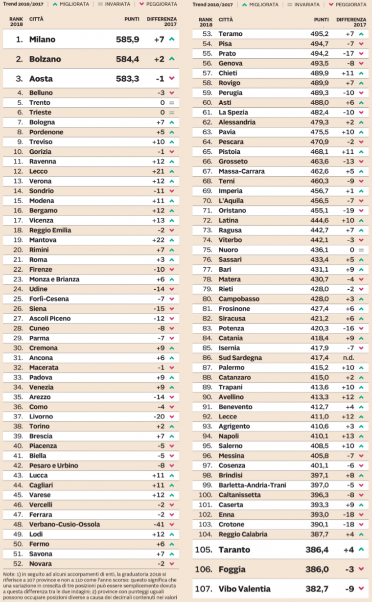 “商业与就业”方面,博尔扎诺位列第一。在“环境与服务”的质量,里雅斯特荣膺桂冠,无论是在福利支出,社会服务等方面都显示出很大的实力。当涉及“司法和治安 ”领域时,费拉拉和拉文纳位居前二,在那里有最办事效率最高的法院。