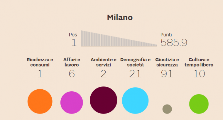 在“财富与消费”这大类中毫无疑问由米兰领导,人均GDP和家庭财富都为很突出。博尔扎诺,贝卢诺和戈里齐亚则分别占据第二,第三和第四的位置。