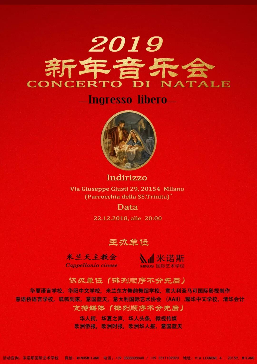 2018年12月22日晚上20:00米诺斯国际艺术学校携手意大利圣马可国际影视制作、意大利国际艺术协会、清华会计、华夏中文学校、华阳中文学校、米兰东方舞韵舞蹈学校、意国蓝天教育、意语桥语言学校、呱呱到家、耀华中文学校在米兰天主教会举办的大型圣诞暨新年音乐会圆满成功!