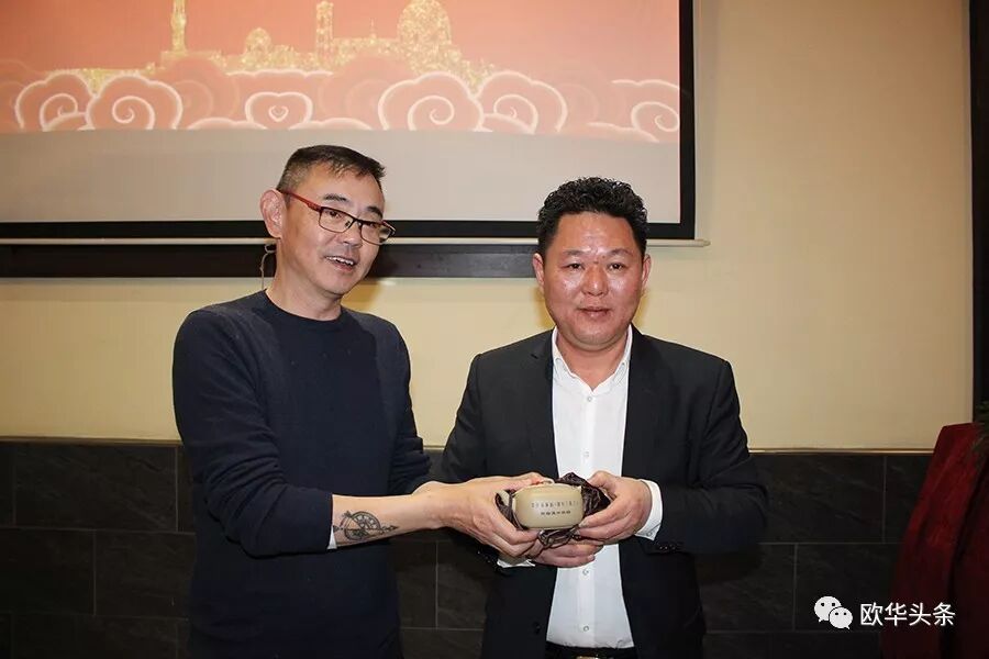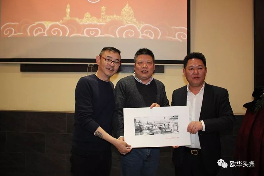 ▲《温州三家人》电视剧摄制组向佛罗伦萨华人华侨联合总会赠送纪念品。