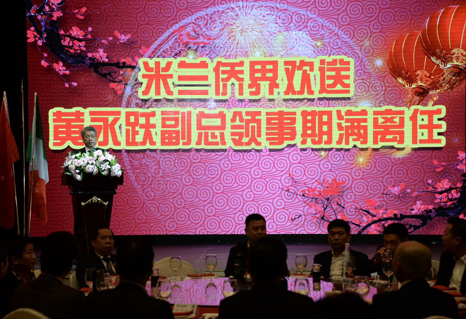 宴会由意大利青田总商会邱王毅会长主持,米兰文成同乡会胡守银会长代表侨界致欢送词。他说,时光荏苒,转眼已是五个春秋,五年多来,黄永跃副总领事的足迹踏遍米兰领区,多次深入侨社,为侨服务,忘我工作,履行使命。始终秉持“以人为本,外交为民”的宗旨,出色地完成了各项工作任务,为促进中国和意大利在经贸、科技、文化等多个领域的交流与合作作出了积极贡献,深得广大侨胞的认可和赞誉。四年多来,黄永跃副总领事与米兰侨界结下深厚的友谊。特别是他那开朗的性格,真诚的待人处事方式,给我们留下了深刻的印象。再过三天,黄永跃副总领事夫妇就要离开米兰返回北京了。在此,让我们衷心祝愿黄永跃副总领事身体健康,合家幸福!同时,我们也真诚希望黄永跃副总领事光荣退休后,常来米兰走走、看看,共叙友情,分享精彩。