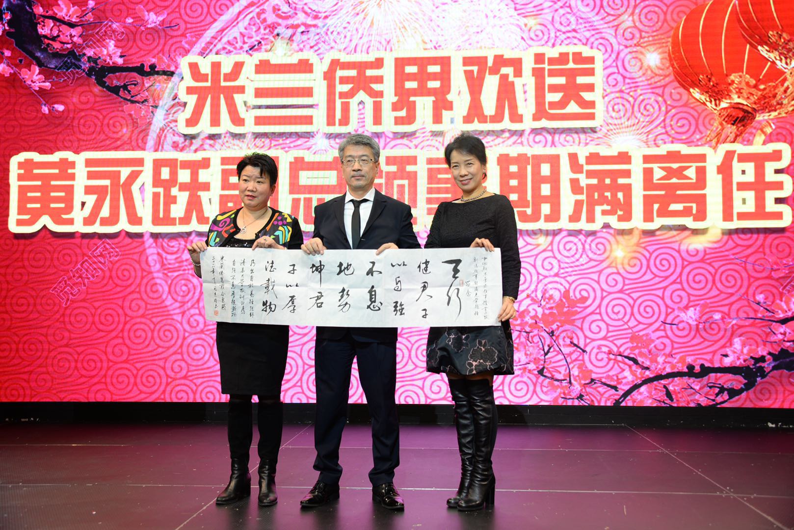 意大利《华人街》消息:1月17日晚,米兰侨界假座新聚宾大酒楼,为期满离任的中国驻米兰总领馆黄永跃副总领事夫妇举行欢送会。宋雪峰总领事、汪惠娟副总领事等领馆官员及米兰各侨团侨领代表、意大利友人等逾百人参加欢送会。