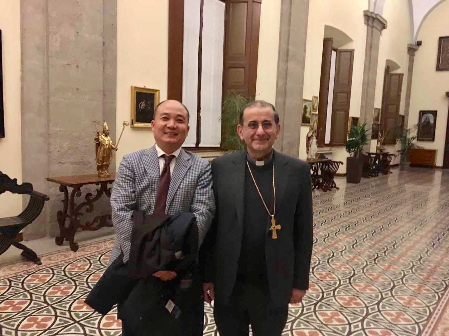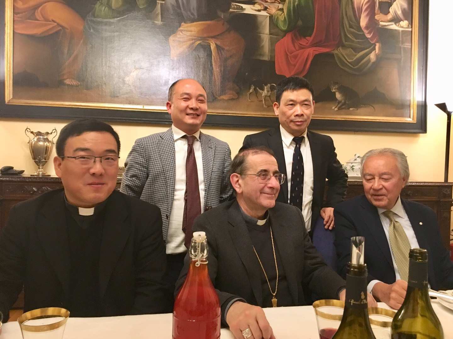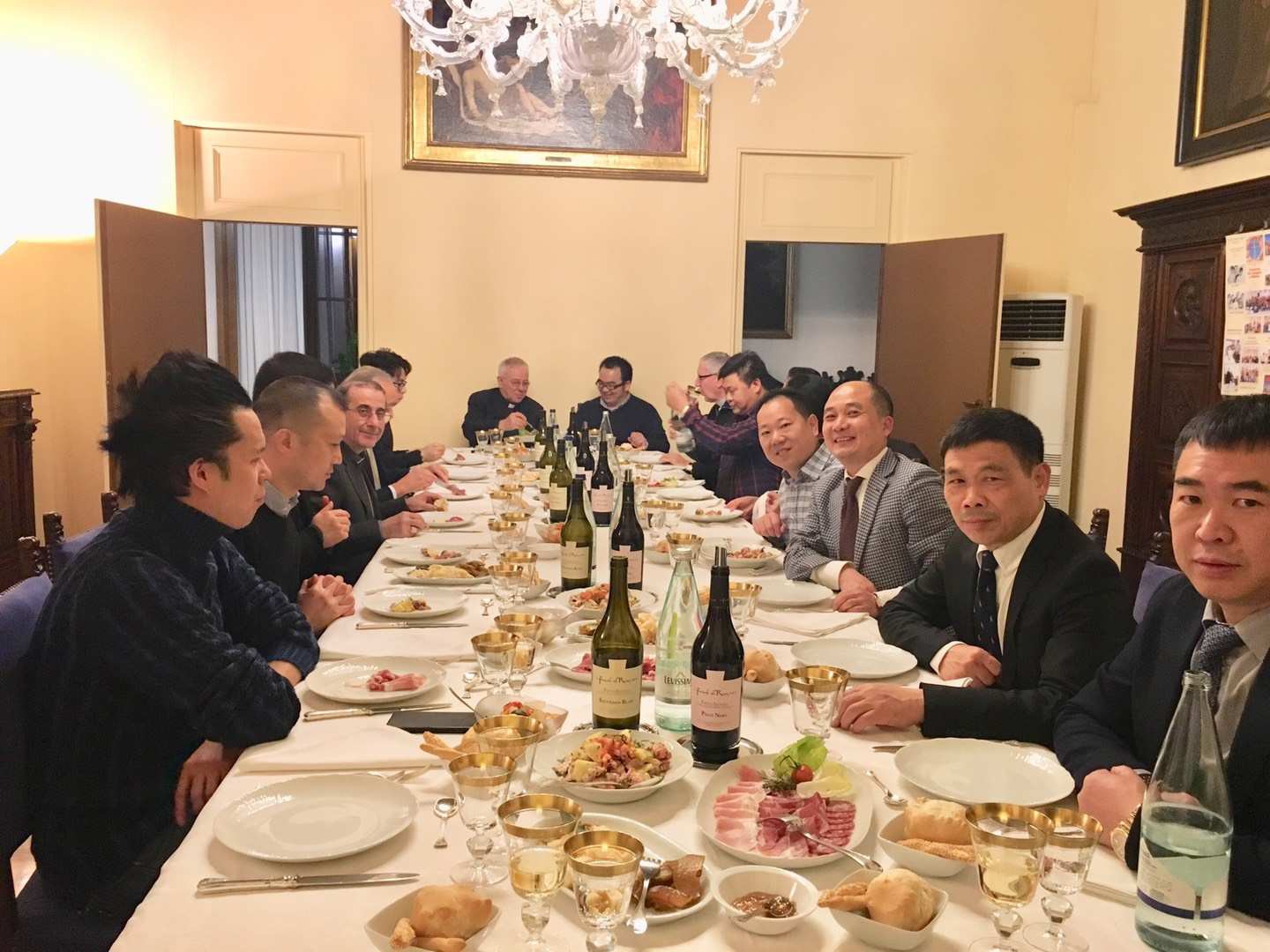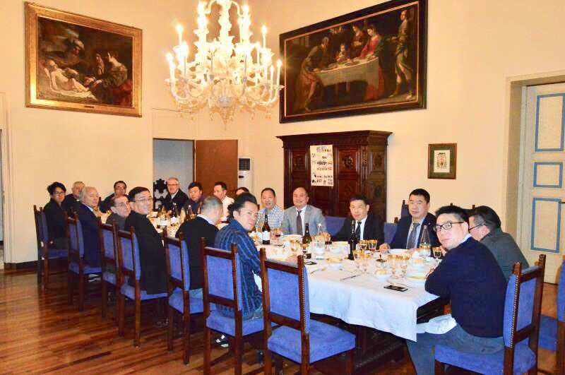 宴会上,与会人士依次自我介绍,大主教听取了大家在意大利生活学习工作的感受。大主教表示对华人的生存状态很感兴趣。他说,华人热情好客,在长期的交往中留下了深刻美好的印象,将对华人提供力所能及的帮助。有人给大主教赠送中国葡萄酒,他爱不释手,仔细欣赏。有人向他介绍,中国十二生肖的来历,并说明2019年农历新年开始,中国将进入猪年。这些都成为当晚大主教感兴趣的话题。