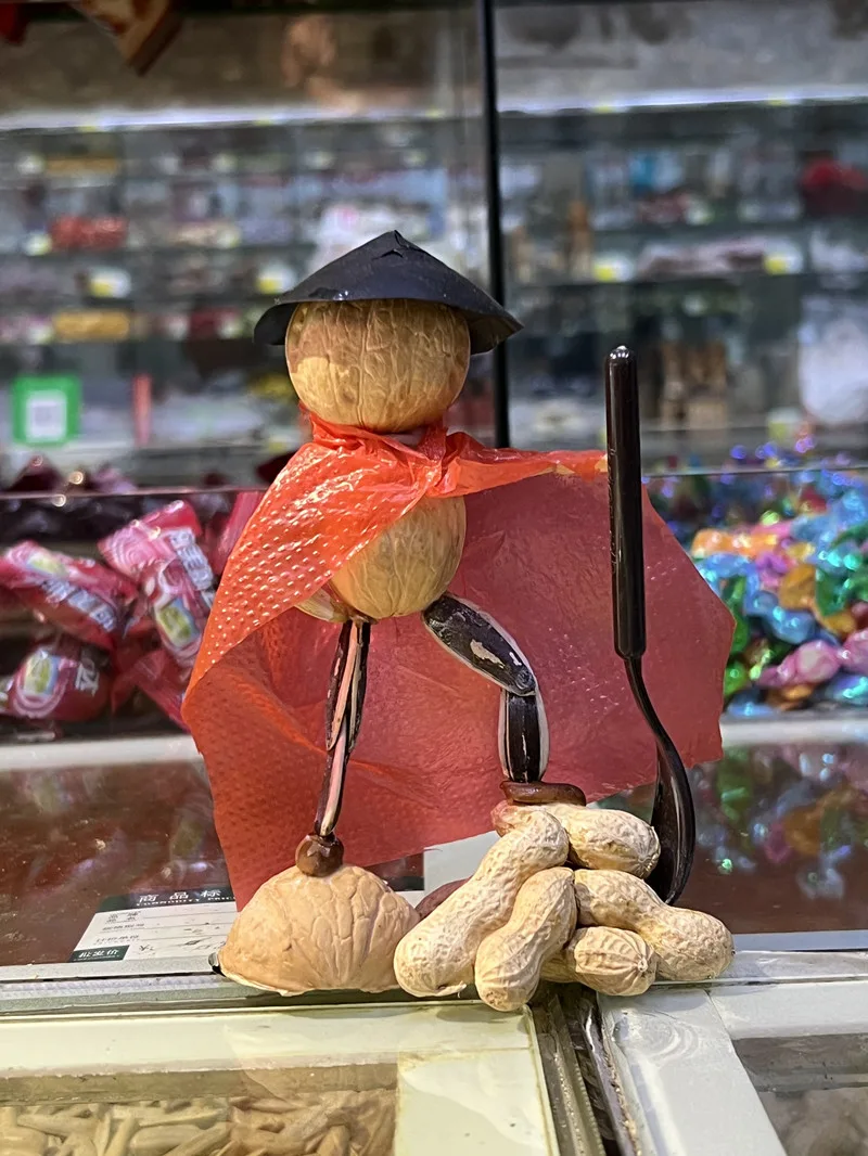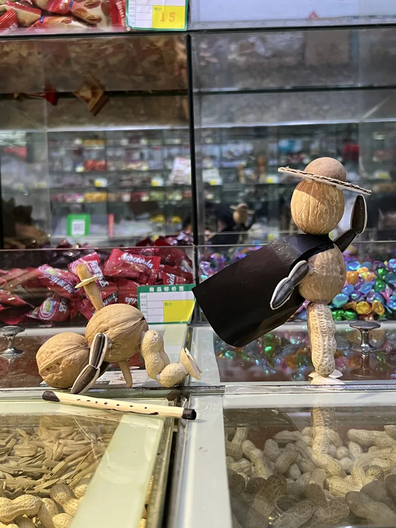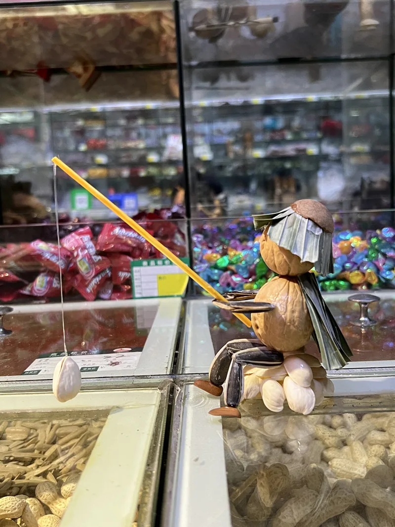 在瑞安市锦湖路上,一家炒货店显得与众不同,柜台上摆起一排排由炒货制作而成的“手办”,有头顶核桃、身披红色塑料袋的“大侠”,有用吸管垂钓开心果的“钓鱼佬”,还有瓜子跪地求婚的“情侣”……