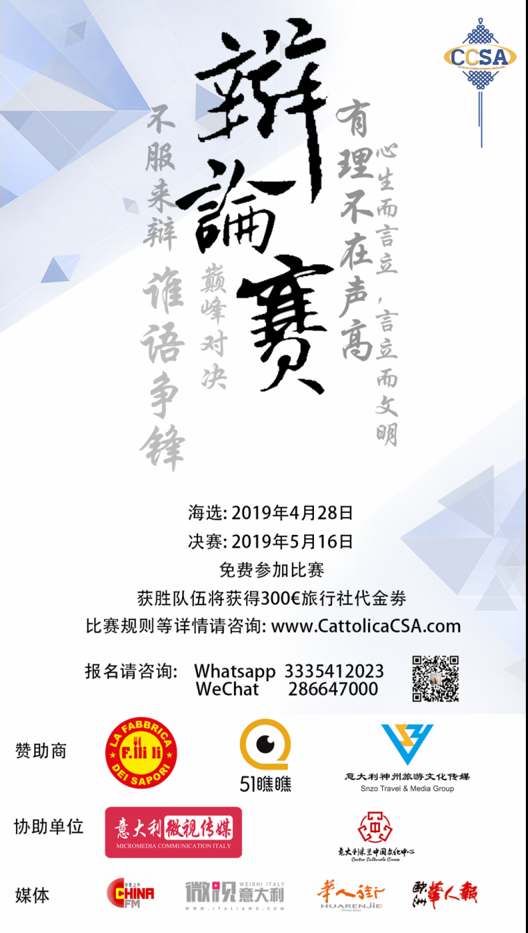 为了给大家提供一个主动进行思考和互相切磋的平台,也为了让辩论赛的文化开始在意大利流行起来,米兰圣心大学华人学联将在近日举办一次意大利留学生与的华裔校园辩论大赛。