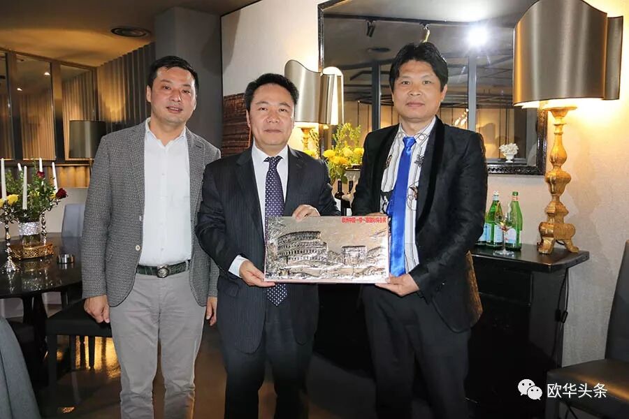 席间,欧洲中国一带一路国际商会主席张松伟(右)向贵州省考察团赠送纪念品留念。