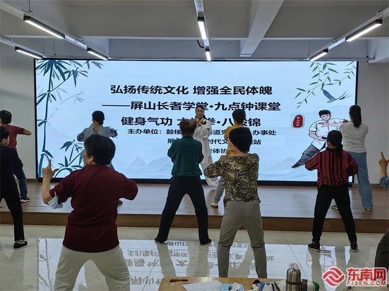 屏山长者学堂里,居民们正在打八段锦。(东南网记者 冯川叶 摄)