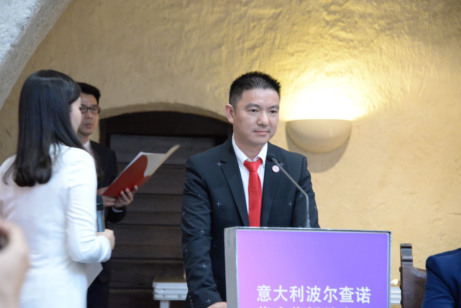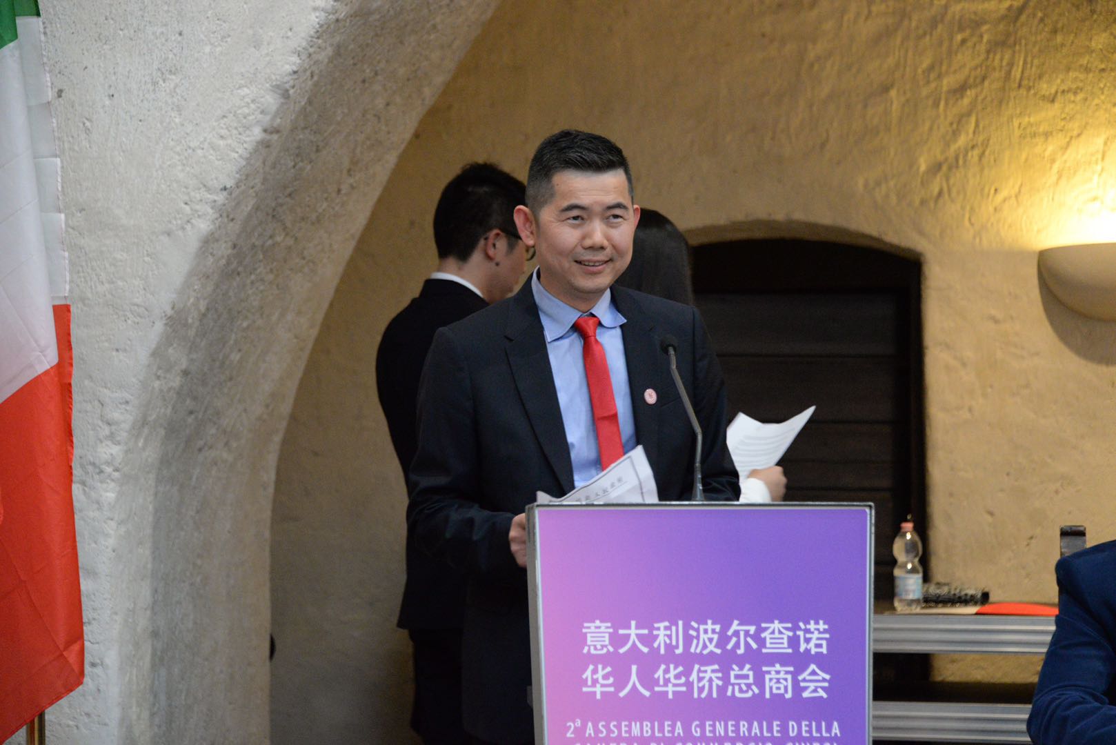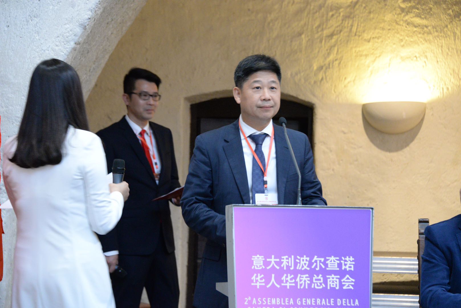 庆典活动由秘书长吴聪主持,魏彧彰⼥士翻译。蝉联第二届会长的温建海先生在任职发言中说到, 五月的波尔查诺,气候宜人,风景秀丽。今天,因为你们的到来,波尔查诺更是充满了欢庆的气氛。在这个美好的日子里,我们欢聚一堂,迎来了华侨华人总商会第二届庆典大会。首先,我谨代表波尔查诺华侨华人总商会全体会员对各位领导及嘉宾的到来表示热烈的欢迎!波尔查诺华侨华人总商会成立于2015年12月14日,一路走来,感谢使馆的正确领导和亲切关怀,感谢意大利各兄弟侨团的大力支持,借此机会,向各位表示最衷心的感谢!