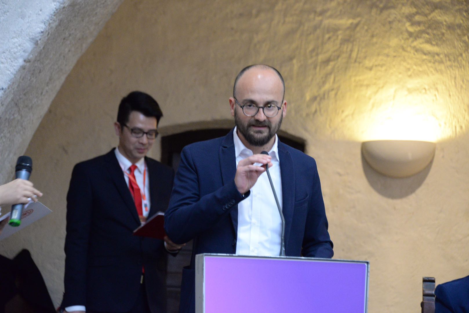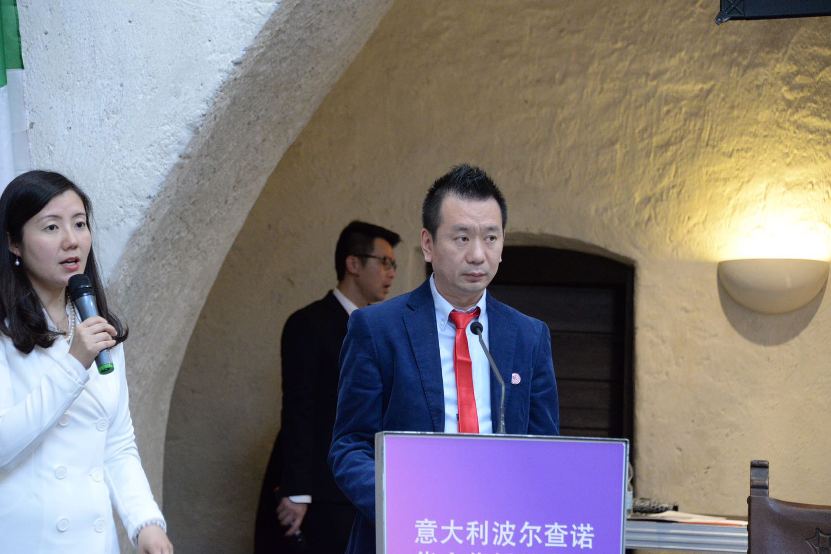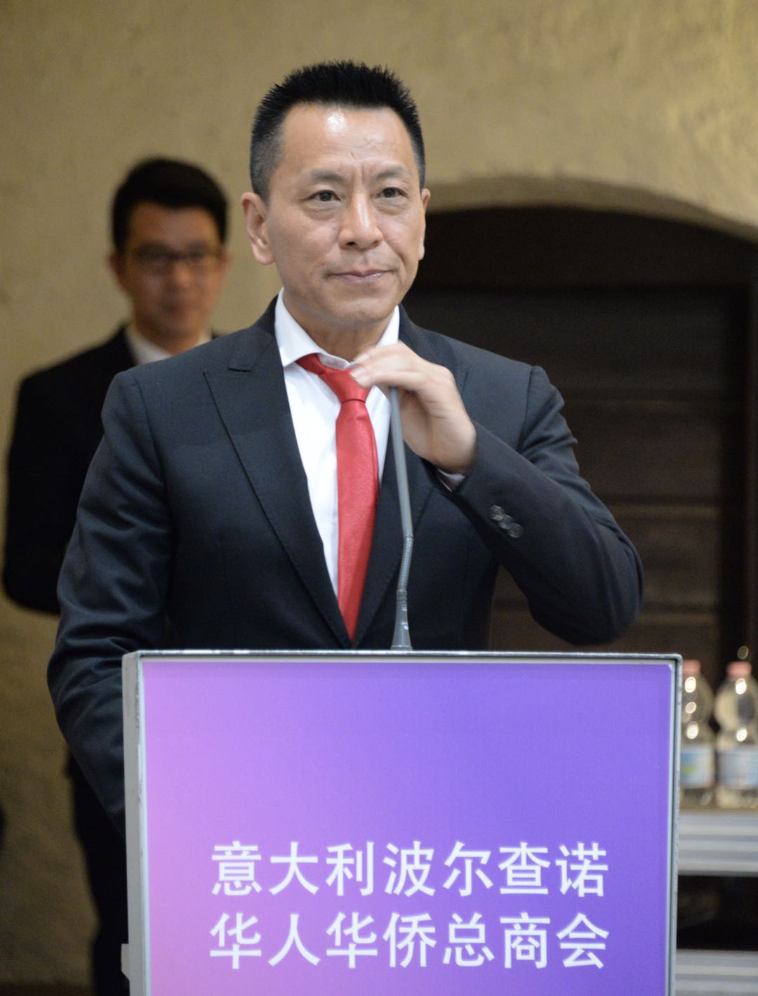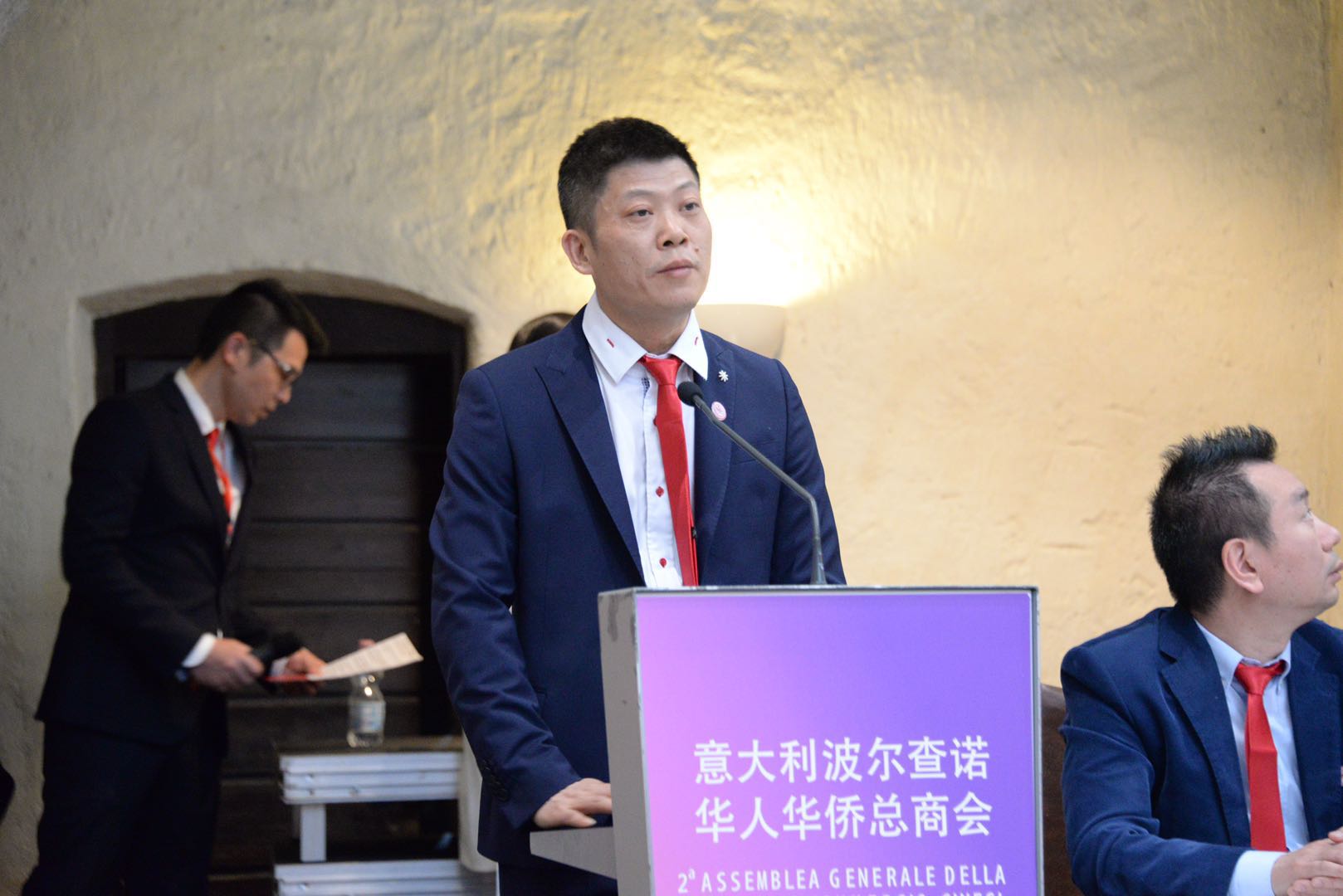 庆典活动由秘书长吴聪主持,魏彧彰⼥士翻译。蝉联第二届会长的温建海先生在任职发言中说到, 五月的波尔查诺,气候宜人,风景秀丽。今天,因为你们的到来,波尔查诺更是充满了欢庆的气氛。在这个美好的日子里,我们欢聚一堂,迎来了华侨华人总商会第二届庆典大会。首先,我谨代表波尔查诺华侨华人总商会全体会员对各位领导及嘉宾的到来表示热烈的欢迎!波尔查诺华侨华人总商会成立于2015年12月14日,一路走来,感谢使馆的正确领导和亲切关怀,感谢意大利各兄弟侨团的大力支持,借此机会,向各位表示最衷心的感谢!