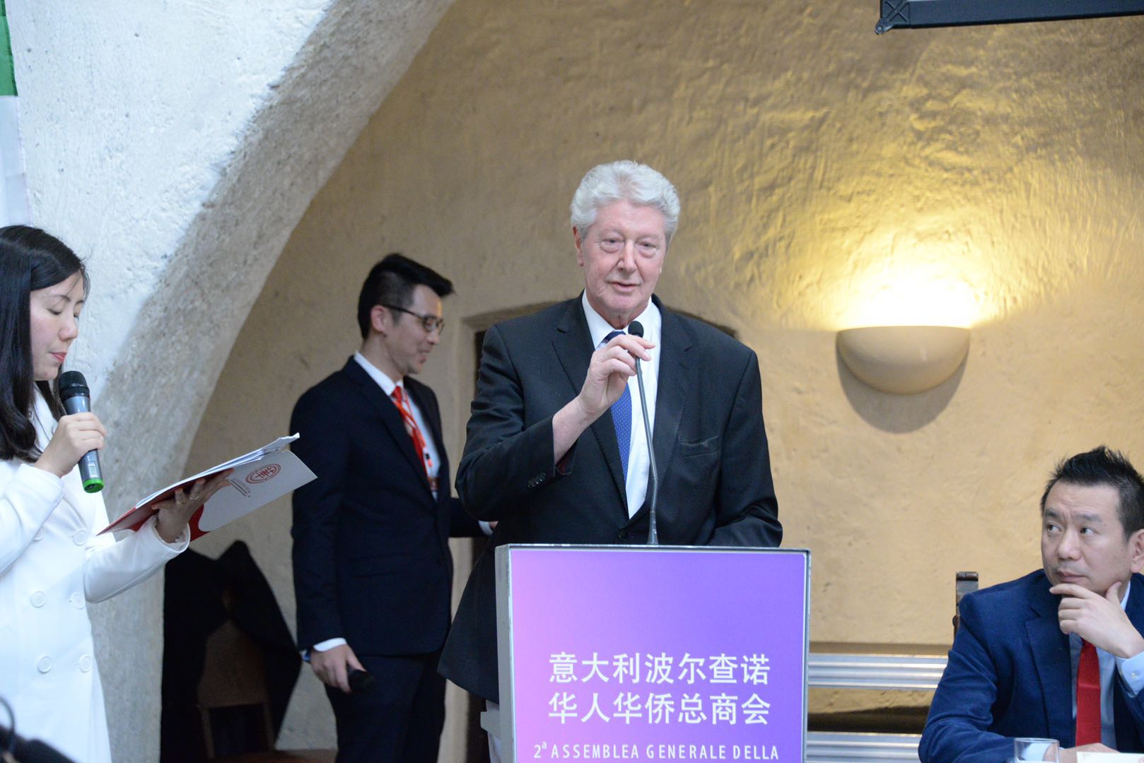 中国驻意大利大使馆参赞吴冬梅女士、波尔查诺市长Caramaschi 先生、Altoadige前任省长Durnwalder先⽣、Altoadige文化厅厅长 Andolfo先生、意大利青田同乡总会会长徐小林先生、米兰华侨华人工商会会长周立新先生先后在主席台发言,对温建海先生蝉联会长之职表示祝贺,并衷心希望波尔查诺华侨华人总商会在温建海会长的带领下,继承和发扬优良传统,汇聚更多力量,活跃会务,开拓进取,抓住“一带一路”合作机遇,为促进侨社和谐发展、中意经贸交流合作做出更大贡献。