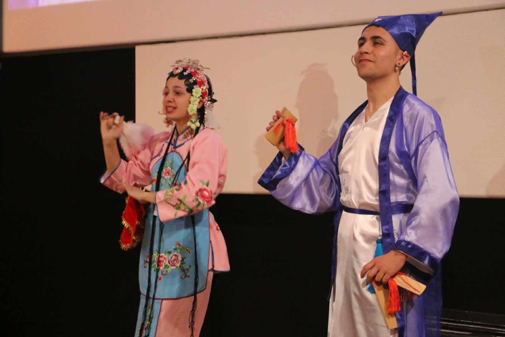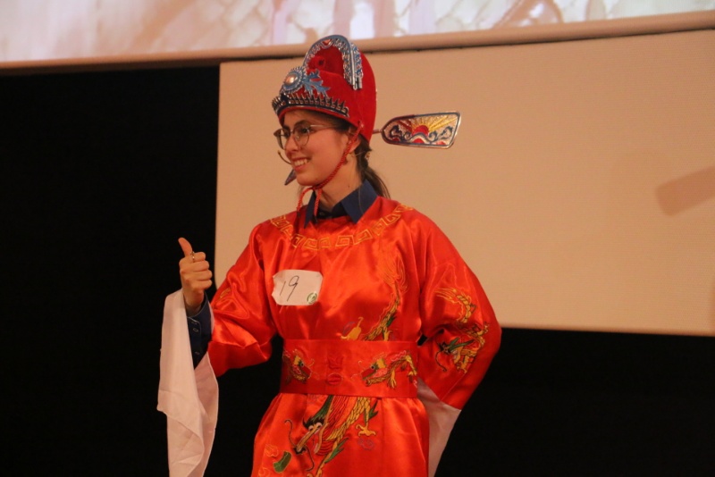 博洛尼亚大学孔子学院选送的选手项微为全场观众带来一曲《女驸马》,金红色的戏服配合黄梅戏的唱腔,举手投足、一招一式间流露出一股专业范儿。