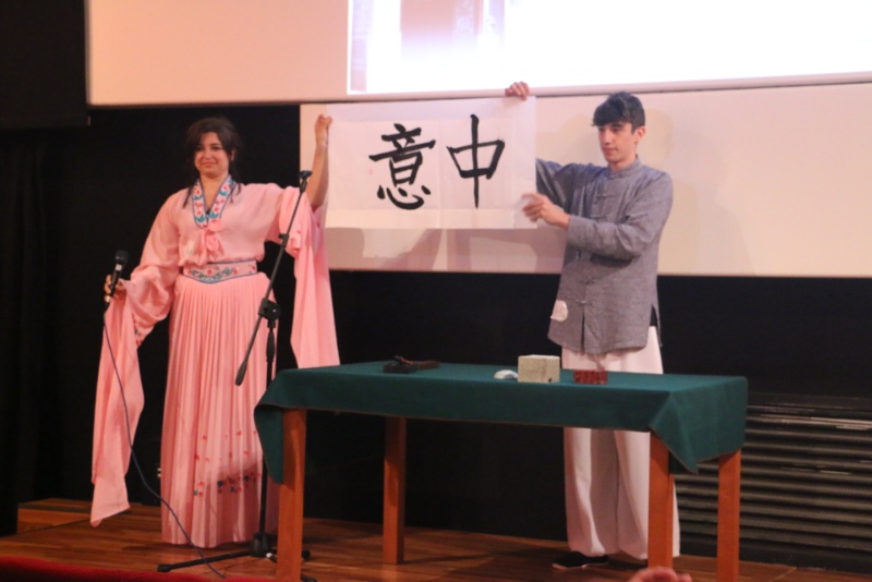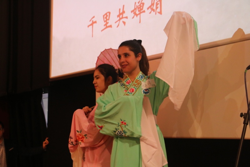 马切拉塔孔子学院选送的选手莫婉丽和师磊一人唱歌《明月几时有》,婉转优美,一人书写毛笔字“中意”,遒劲有力,两者刚柔并济,展示出中华文化的兼容并包与丰富多彩。