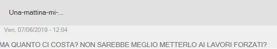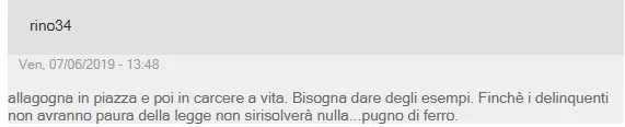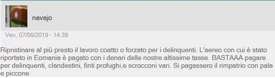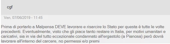 网民@cgf:在把他押送到马尔彭萨机场之前,他必须要先让他服劳役来补偿国家(还遣返的费用)。如果他真的想要留在意大利,出于“人道主义”,我们也要让他一直待在牢里,一直服劳役至死。在服刑期间没有任何赦免。