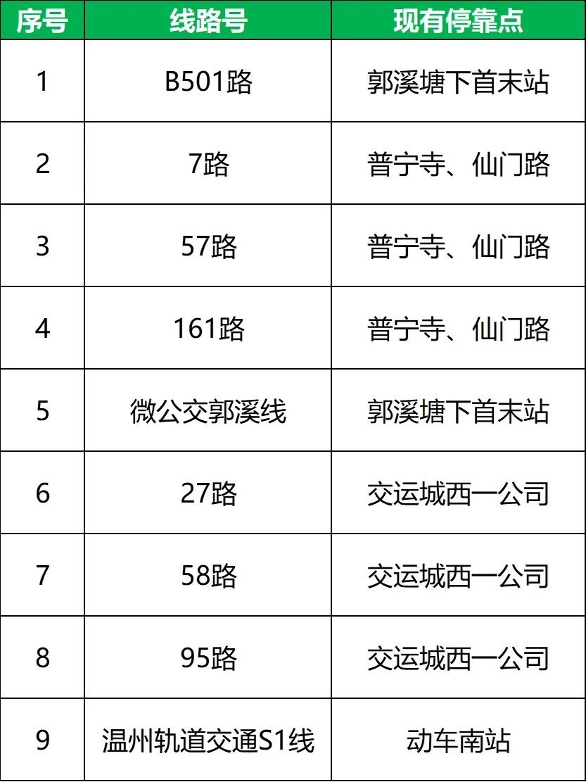 试运行期间,市民朋友们可乘坐B501路、7路、27路、57路、58路、95路、161路、微公交郭溪线等8条公交接驳线路及温州轨道交通S1线前往园博园附近,可选择适宜停靠站就近下车。