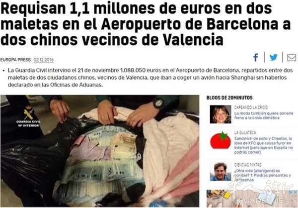 《20分钟报》关于2名华人携110万欧元从巴塞罗那前往上海的报道。(图片来源:《20分钟报》网站截图)