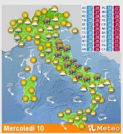 恶劣的天气正在逐渐南下,并将在明日(10日)持续影响中南部地区,其中艾米利亚 - 罗马涅地区的天气情况最差,特别是在博洛尼亚及里米尼(Rimini)省将有强风和冰雹天气。随后冰雹及大风天气将沿着亚得里亚海海岸地区继续南下,沿途影响马尔凯地区和阿布鲁佐地区(Abruzzo),普利亚(Puglia)地区也将受到影响。预计托斯卡纳、翁布里亚(Umbria)、拉齐奥内陆地区也将有短时雷阵雨。