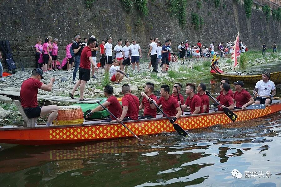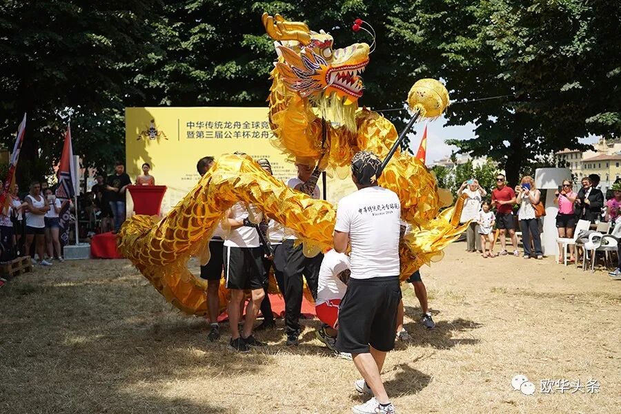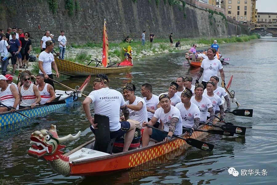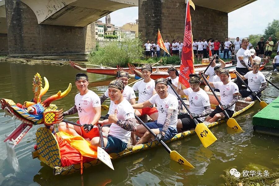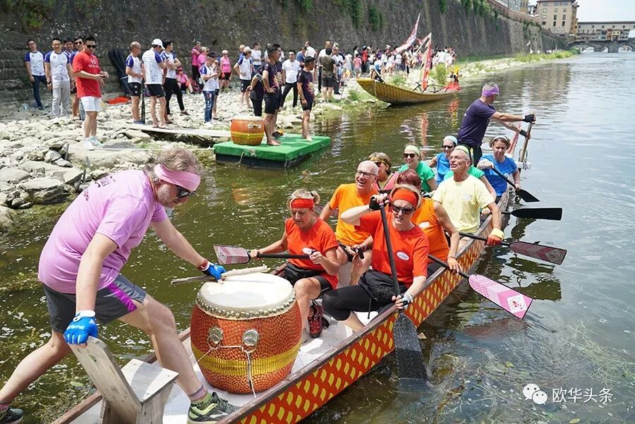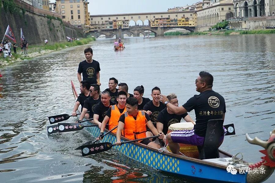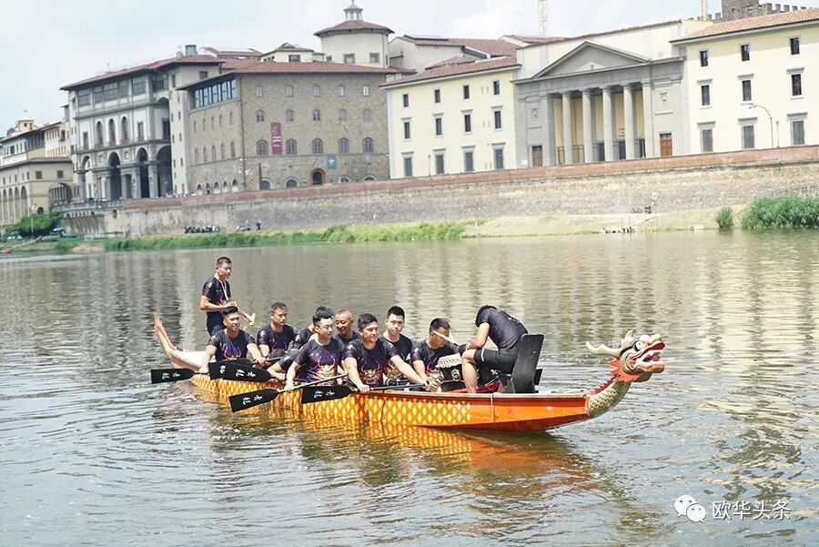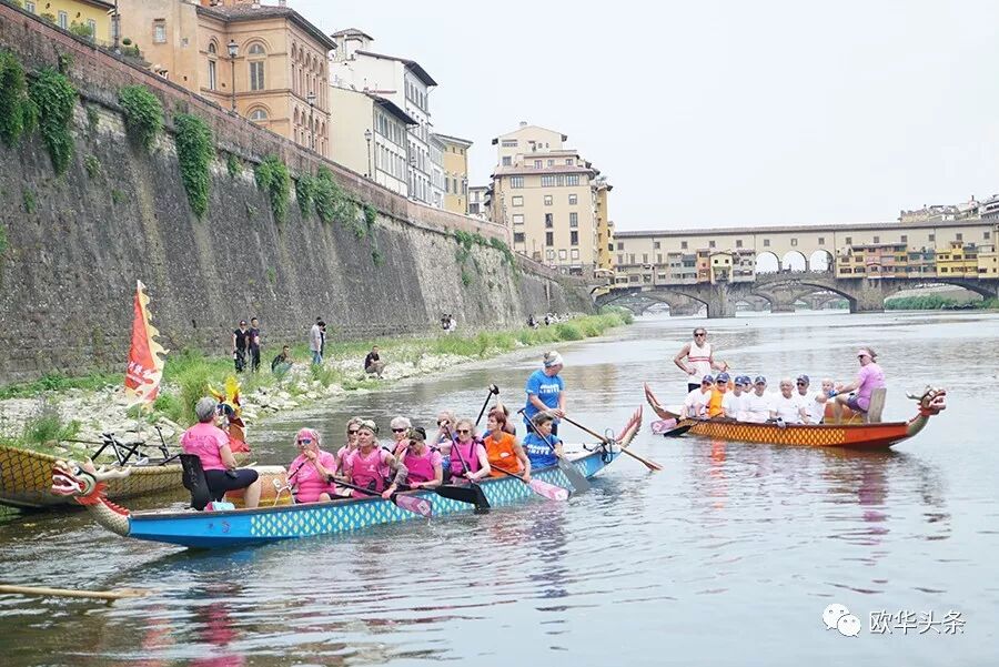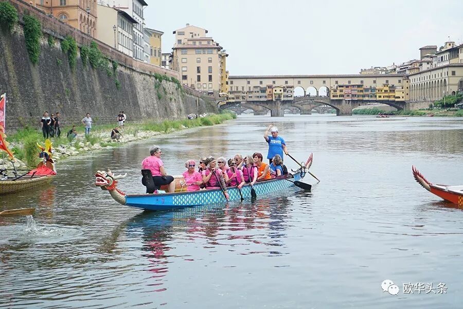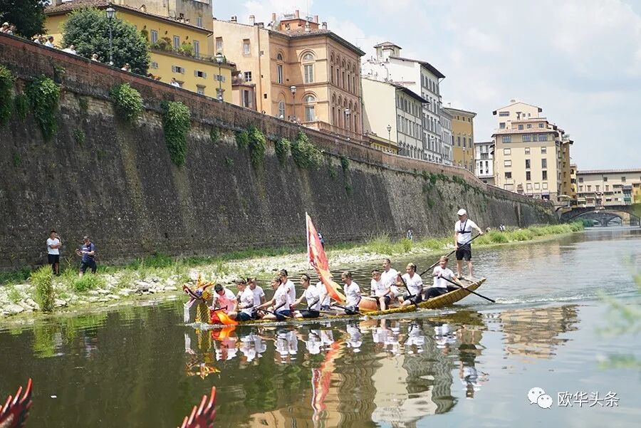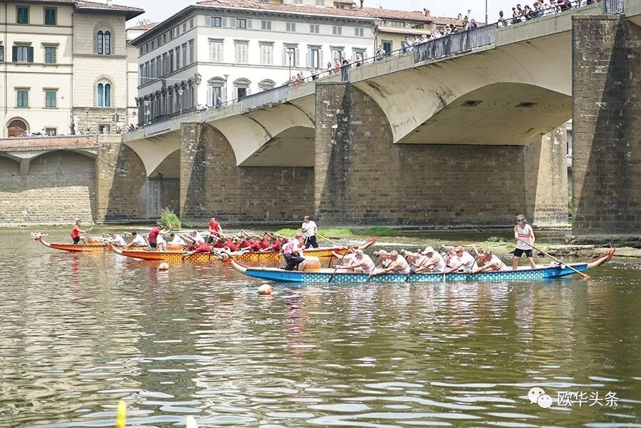 天然优美的河流,是划龙舟的好场所,队员们鼓足劲,拭耳以待,鼓声一响,三船齐发,你争我赶,溅起似雪浪花,恰如三条巨龙在水中飞腾。两岸围满了观众,佛罗伦萨金桥上的游客纷纷驻足观看,他们有的聚精会神、有的呐喊助阵,有的拍照摄影,不时为奋力向前、力争上游的赛手们喝彩和鼓掌,现场锣鼓声、喝彩声、掌声汇成一片,气氛热烈,激动人心。