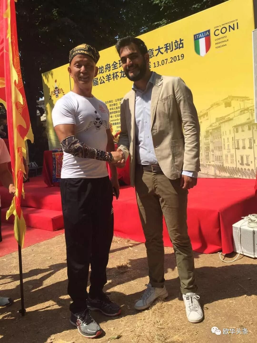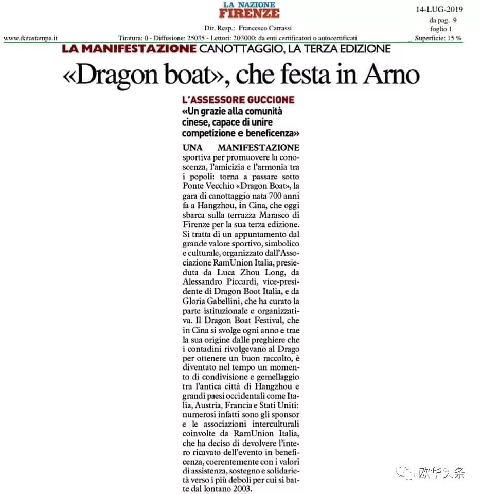 此次龙舟竞技盛事引起了意大利国家电视台的注意,专派记者来现场采访,托斯卡纳大区各电视台市电视台和主要媒体如国家报 大公报,当地头条新闻,都积极报道龙舟大赛带来的新思路和正能量!佛罗伦萨市体育部部长Cosimo Guccione 在赛后感谢华侨华人社团,称赞中华民族是个具有能把竞技和公益精神融为一体的能力,,是一个具有能把不一样的传统,化为繁荣幸福的正能量贡献给社会的群体!我们希望佛罗伦萨成为东西方文明融合发展的新文艺复兴的摇篮!我们相信彼此努力一定会把我们带向同一个方向,那就是和平,和谐,繁荣和幸福!而中华传统龙舟竞技就是双方合作桥梁的新品牌!
