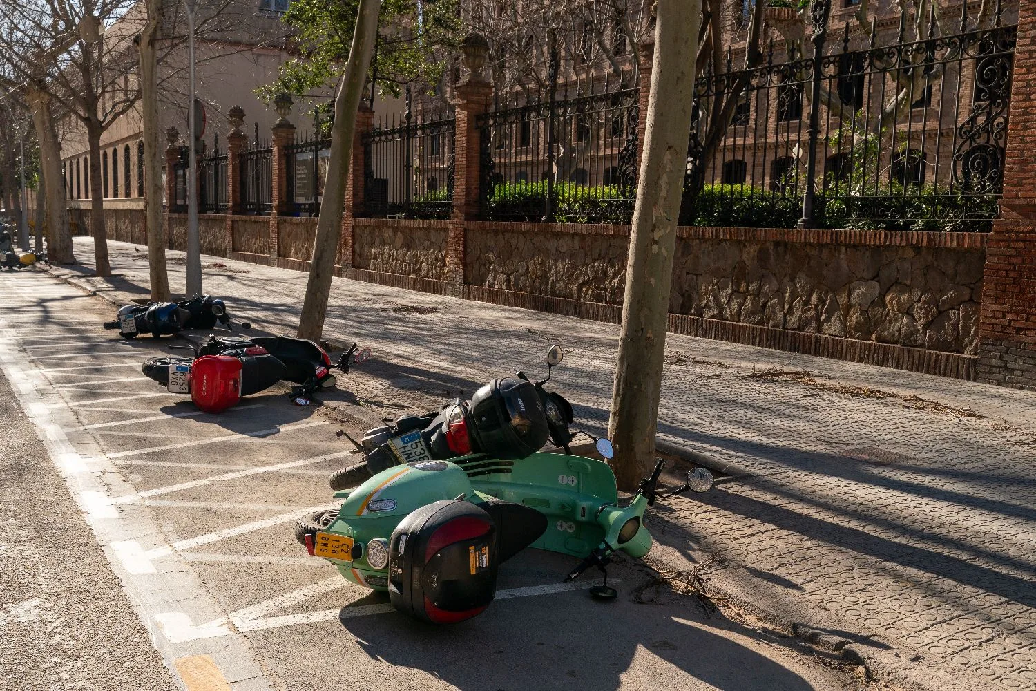2月12日在西班牙巴塞罗那市中心拍摄的被风吹倒的摩托车。