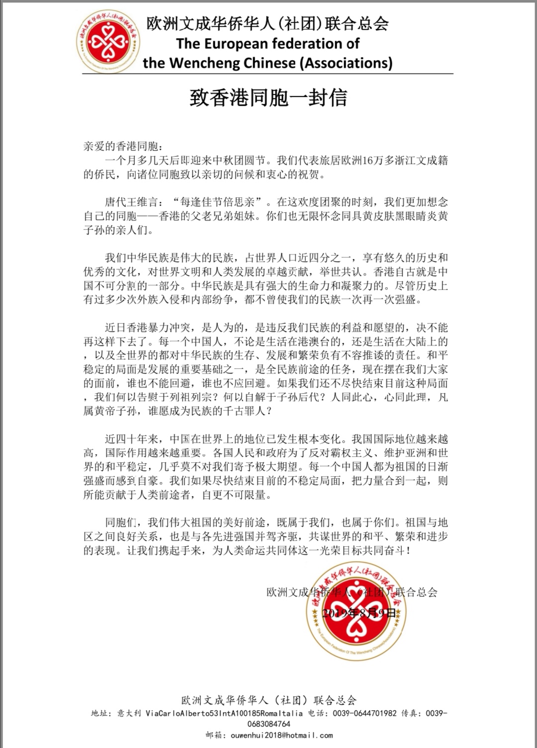 亲爱的香港同胞: 一个月多几天后即迎来中秋团圆节。我们代表旅居欧洲16万多浙江文成籍的侨民,向诸位同胞致以亲切的问候和衷心的祝贺。