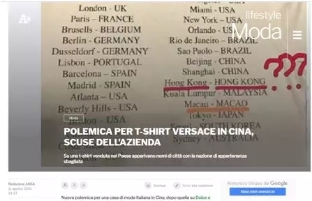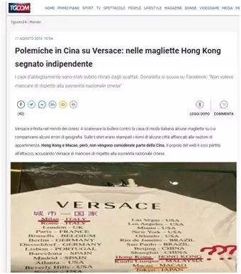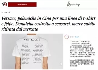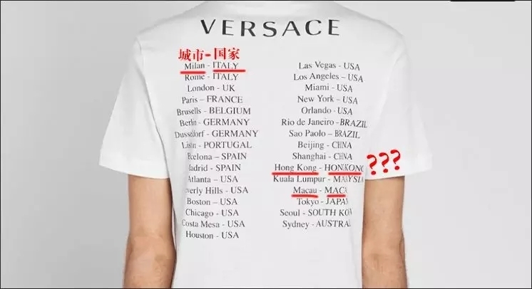 近日,一名网友在微博上发文指出,意大利奢侈品牌范思哲(Versace)的一款男士T恤印花上,将香港和澳门列为国家,涉嫌“港独”“澳独”。