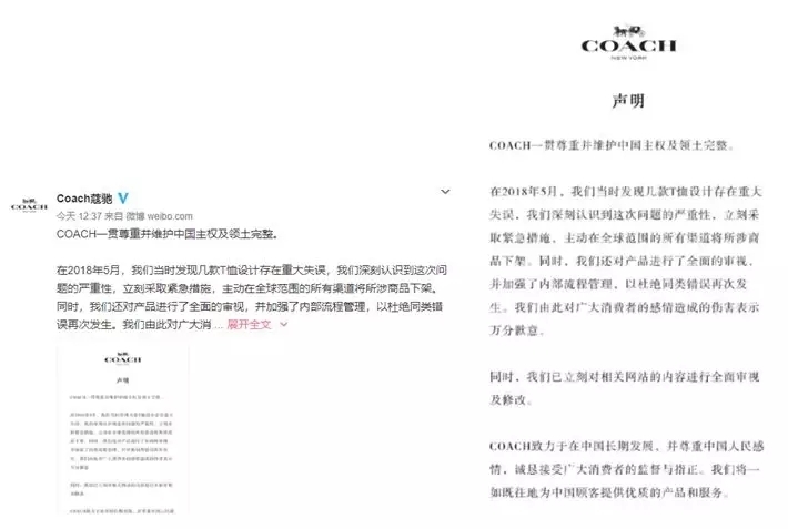 蔻驰发表声明称“Coach一贯尊重并维护中国主权及领土完整。”