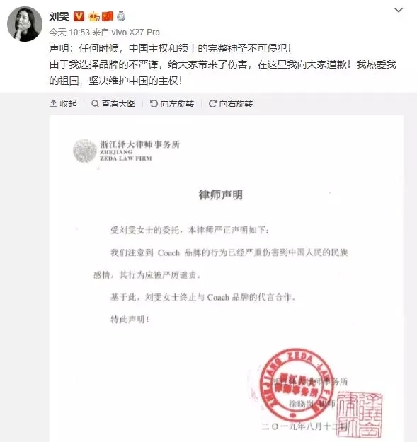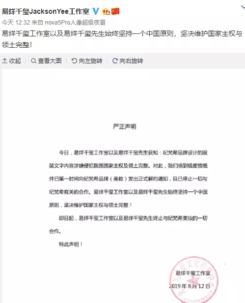 事情一出,蔻驰代言人刘雯第一时间在微博发表声明,称任何时候,中国主权和领土的完整神圣不可侵犯!终止代言合作!而纪梵希美妆品牌代言人易烊千玺,也通过@易烊千玺JacksonYee工作室发布声明,宣布与纪梵希(美妆)解约,停止一切与纪梵希相关合作,坚决维护国家主权和领土完整。