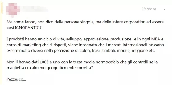 同时,意网民也纷纷表示无法理解这个错误怎么没人发现。其中一名网民评论道:“他们是如何做到的?整个公司的人都是如此无知吗?产品从被生产到投入市场这个过程就没人发现问题吗?而且在每个MBA课程和市场营销课程中,都有提及各个国家在颜色、语句、符号、道德、宗教等方面的看法大不相同。这个就是一个初三的学生都知道的错误,难道他们(这个品牌公司)就舍不得拿出哪怕100欧元来请人检查吗?!太疯狂了!”