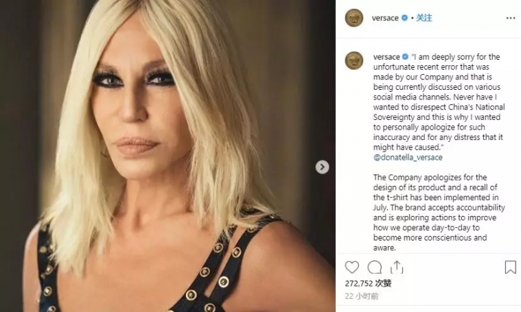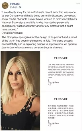不知是否是迫于压力,11日,范思哲在其Instagram、脸书等官方账号上发布道歉声明,并附上了该品牌创意总监Donatella Versace的中英文道歉信。
