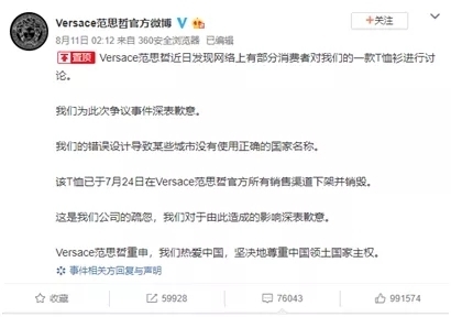 随后,@Versace范思哲官方微博发表道歉声明,称该款T恤已于7月24日在范思哲官方所有销售渠道下架并销毁。
