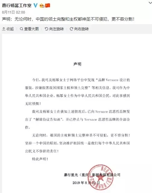 范思哲涉嫌“港独”“澳独”的T恤被曝光后,其品牌代言人杨幂8月11日凌晨通过@嘉行杨幂工作室发表声明,称“无论何时,中国的领土完整和主权都神圣不可侵犯,更不容分割!”并宣布已停止与Versace的所有合作。