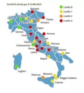 今日(12日),意大利最热的地区为普利亚、西西里岛、撒丁岛,以及坎帕尼亚、拉齐奥、托斯卡纳和马尔凯部分地区。其中罗马和佛罗伦萨气温高达37℃-38℃。意大利卫生部今日在罗马、博尔扎诺(Bolzano)、的里雅斯特(Trieste)、博洛尼亚、佛罗伦萨、安科纳(Ancona)、拉蒂纳(Latina)、列蒂(Rieti)、坎波巴索(Campobasso)、弗罗西诺内(Frosinone)和佩鲁贾等11座城市拉响最高级别的红色高温警报。