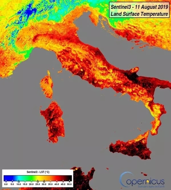 在哥白尼计划的官方推特上发布的图像来看,意大利多个地区标记温度的颜色已经接近为黑色。在该图像示例中,黑色地区的地表温度约为50℃,红色地区约为40℃。