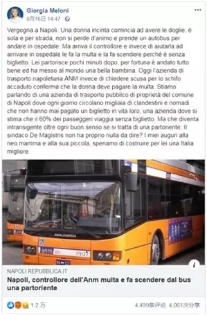 “那不勒斯公交公司ANM非但没有为发生如此恶心的事情道歉,反而还坚持要这名女士支付罚款。”意大利兄弟党领袖乔治·梅洛尼(Giorgia Meloni)在社交网络脸书(Facebook)上谴责道:“那不勒斯每天有数千名非法移民和流浪汉不买票坐公交车,而且这些人从来不买票。这家公交公司估计有60%的乘客都逃票。反而对一名产妇一点也不妥协。”