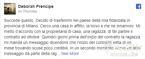 这名为黛博拉的女孩描述了事件的经过。她决定搬到米兰于是找出租的房屋,在相中当事房东的房子后,她同房东的女儿取得联系并商定合同从10月开始。但就在履约的前十五天,房东女儿发了一条消息编造了一些借口后总之告知黛博拉必须在等一个月才能入住。之后又发消息说房子不能租给她了因为现在他们准备把房子卖掉。