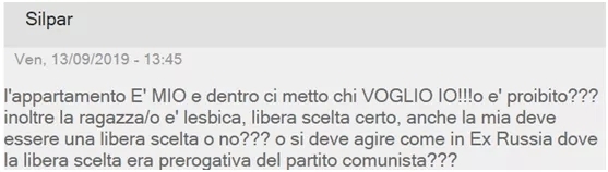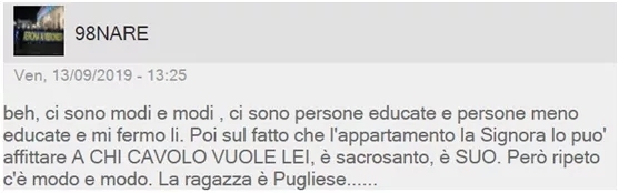 图片来源:Deborah脸书截图 然而,在就在合同生效前的15天,情况突然发生了变化。房东女儿给Deborah发来信息,找了一些借口告知Deborah要推迟1个月才能入住。之后,Deborah又收到另一条信息,房东女儿称她们要卖掉房子,不出租了。Deborah回复称,在履行合约的最后1分钟改变主意的做法是不正确的。随后,当事房东直接介入,告知Deborah不把房子租给她是因为她出生在福贾,该房东认为她的房子不能有南方人入住。 · 米兰女房东称“我就是种族主义者,我的房子不租给南方人!” 据报道,Deborah将当事女房东在whatsapp上发给她的语音公布在脸书上,这位女房东言辞激烈,应该没人会期待在2019年还有热能说出这样的话:“对我来说,不论是在2000年还是在4000年,南方人就是南方人。在我看来南方人和黑人、吉普赛人都是一样的。我就是一个百分百的种族主义者,您(指Deborah)的想法我一点都不在乎。我只看身份证上写的是什么,您不是瑞士人,而是个南方人!如果我早知道(你是南方人),我早就拦下我女儿了。” 当Deborah向她表示要公开这一事情时,这位女士更是直言:“那您记得写上我是萨尔维尼的支持者。” 对于女房东这一言论,萨尔维尼在米兰参加会议期间对此评论称:“这位女士(指女房东)就是个傻瓜,她的想法跟我的想法离的很远,联合并团结意大利南方和北方是永远的选择。”