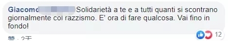 图片来源:萨尔维尼接受采访视频截图 · 女房东接受电台采访并道歉 女房东于13日在Radio 24电视台的La Zanzara节目接受了采访,她称自己既不是种族主义者也不是萨尔维尼的支持者。并称“是这个女孩的言行让我做出这种疯狂的行为,她说我不继续租房给他,但是我有权决定自己把房子租给谁。我自己在南方也有亲戚。” 最终女房东向Deborah道歉。 Deborah将自己的经历发布在社交网络上后,引发了网友的激烈讨论, 有网友对女孩表示支持。 网友@Giacomo:声援你和那些每天都面对种族歧视的人,是时候做些什么了!