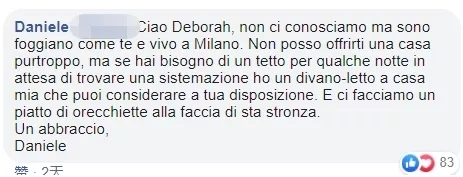 网友@Daniele:Deborah你好,虽然我们并不认识,但是我也来自福贾,住在米兰,非常遗憾我不能提供房子给你,但是如果你有需要,我住的地方有个沙发床可以帮你度过几个晚上,让我们一起来对抗那个混蛋女房东。