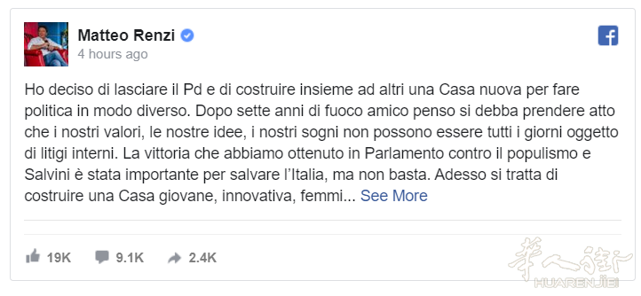 意大利《华人街》消息:前意大利前总理马泰奥·伦齐(Matteo Renzi)今日在脸书宣布脱离所属的现执政联盟中的中左翼政党民主党(PD)自立门庭。上任未几的黄红政府前景也被伦齐的脱党蒙上一层阴影。