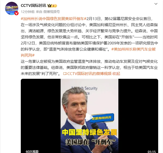 2月13日,第62届慕尼黑安全会议首日,在一场涉及气候变化问题的分组讨论中,美国加利福尼亚州州长、民主党人纽森指出,清洁能源、绿色发展是大势所趋,关乎经济繁荣与竞争力提升。纽森说,中国坚持绿色发展,他非常钦佩这一点。可相比之下,美国却在“开倒车”——当地时间2月12日,美国总统特朗普宣布撤销美国环境保护署2009年发表的一项研究报告中的科学认定,即“温室气体排放危害公众健康和福祉”。