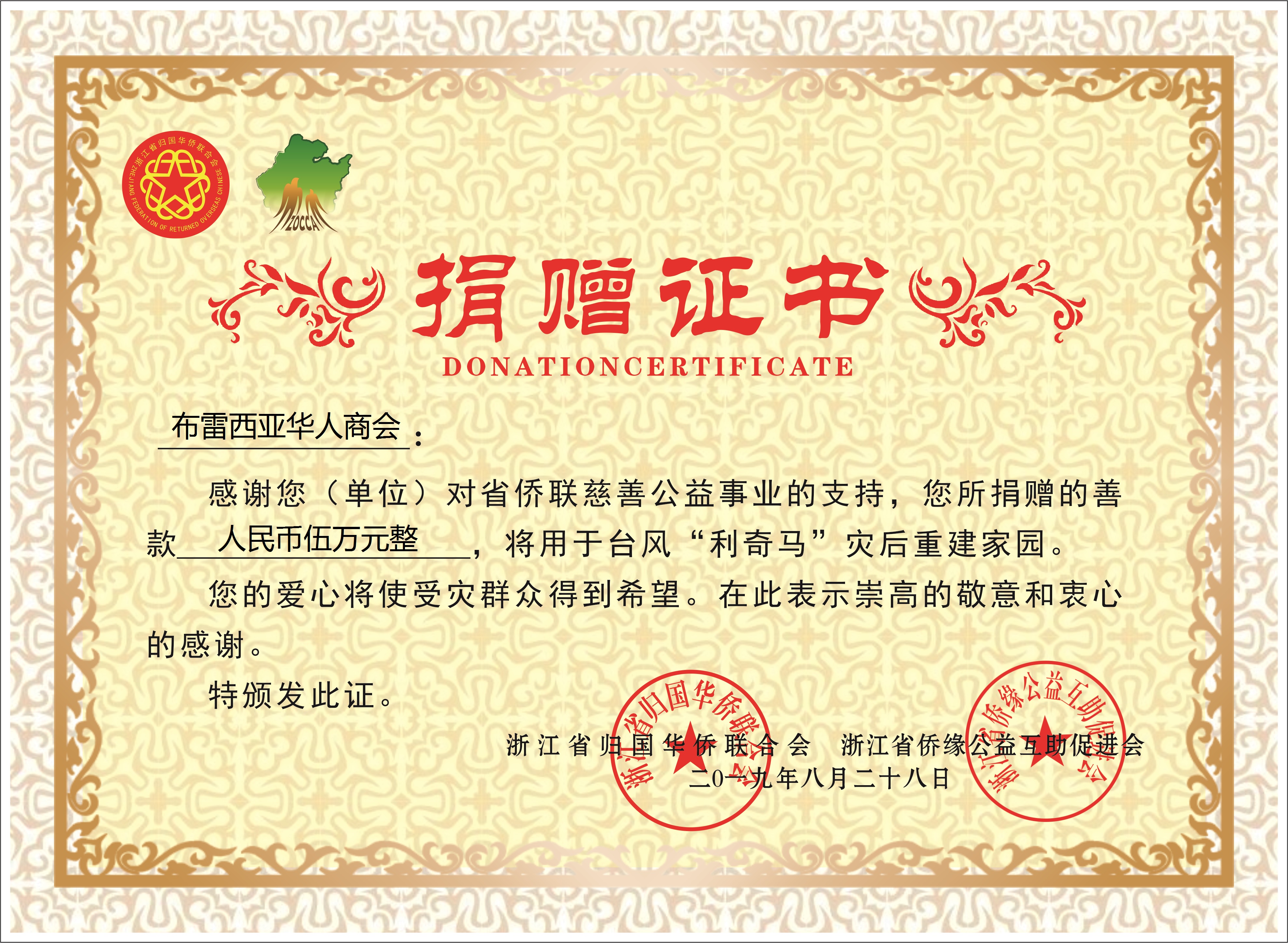 一方有难,八方支援,这是中华民族的优良传统。浙江省侨联第一时间向海内外侨团发出倡议书,动员侨界力量为灾区排忧解难。为了支援灾区抗台救灾,重建家园,布雷西亚华人商会金忠信会长迅速组织会员“奉献爱心,捐资救灾”。侨胞们虽然身在海外,但心系灾区同胞,为灾区的重建伸出了援助之手,共捐得善款5万元人民币,这笔善款已通过浙江省侨联捐赠给灾区。(异域)